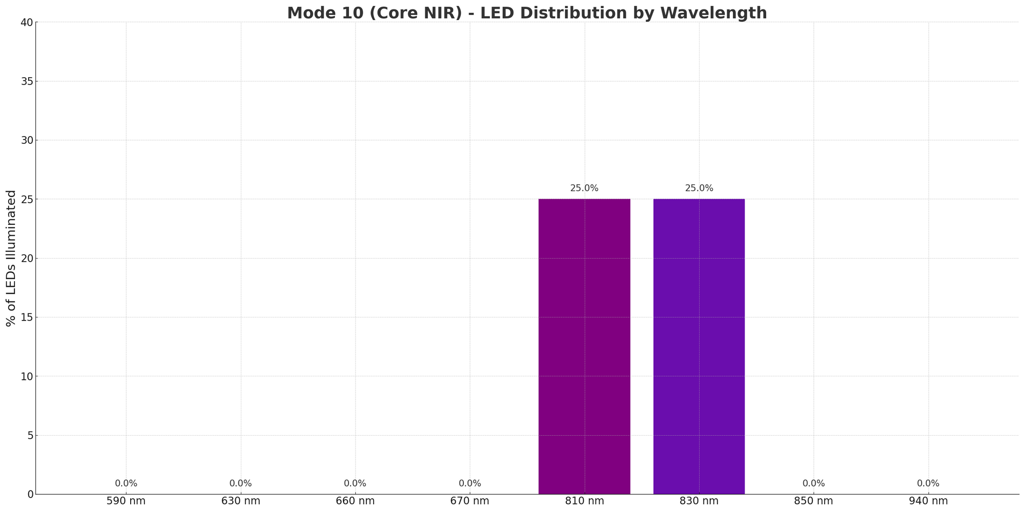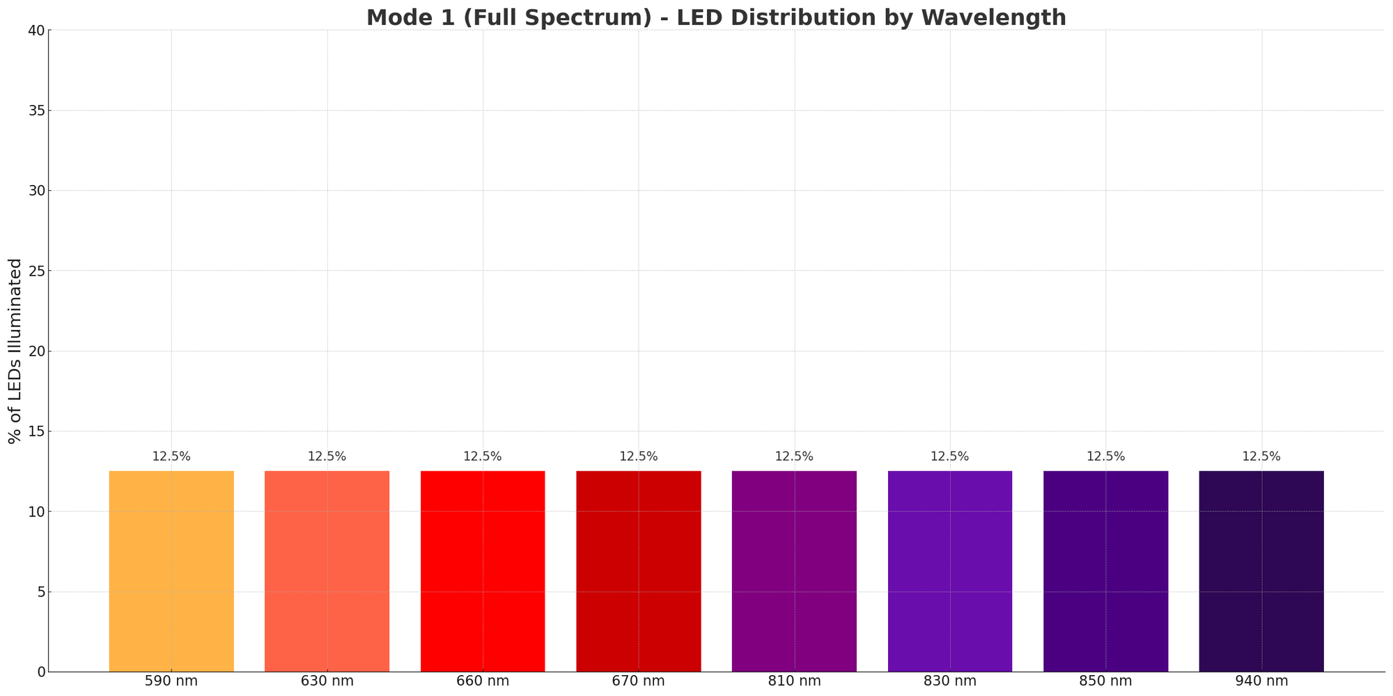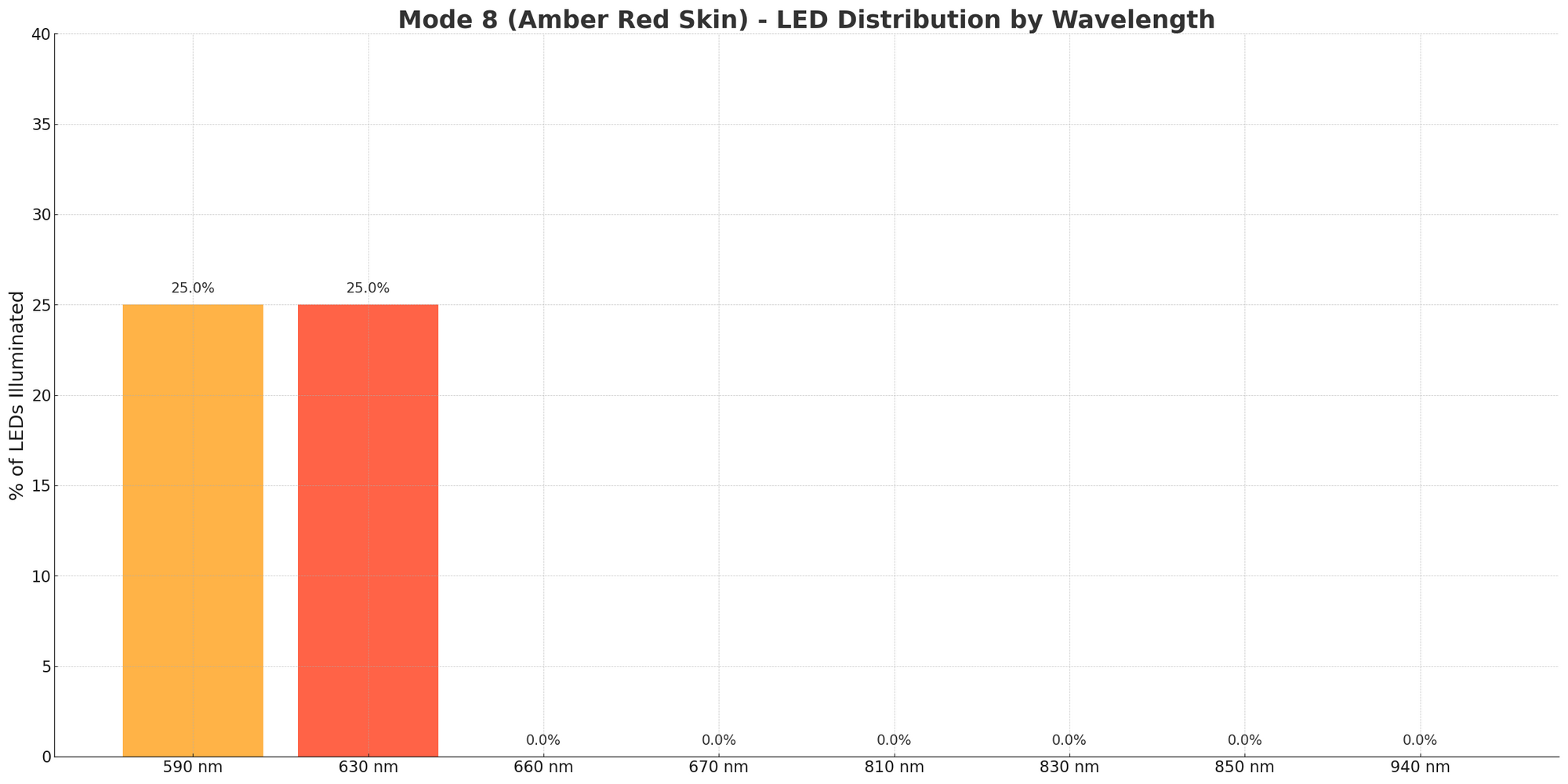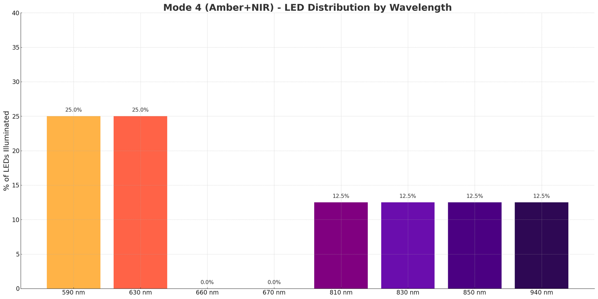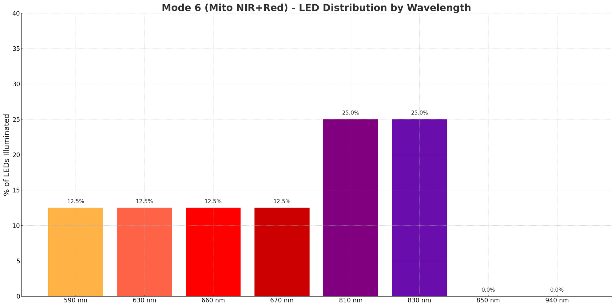 The MitoADAPT 4.0 uses eight wavelengths: 590nm (amber), 630nm, 660nm, 670nm (red), 810nm, 830nm, 850nm, and 940nm (near-infrared).